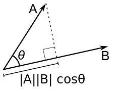 Скалярное произведение (англ. dot product) двух векторов равно произведению их длин и косинуса угла между ними. Для него справедлива следующая формула: