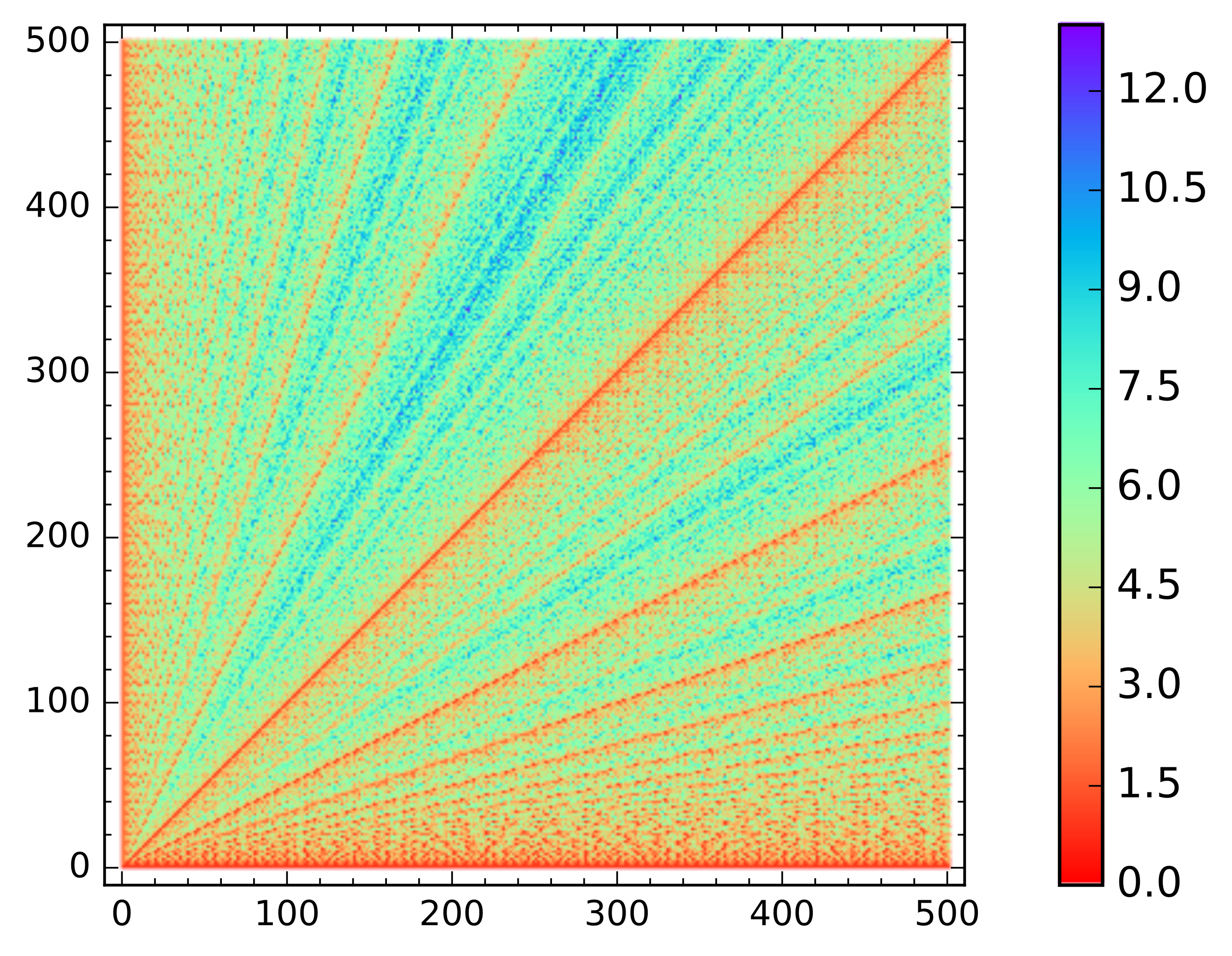 Примечательно, что худшие входные данные для алгоритма — это соседние числа Фибоначчи. На графике они видны как синие точки в пропорциях золотого сечения.