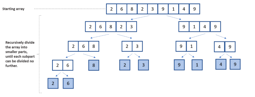 Сортировка слиянием – это алгоритм вида “разделяй и властвуй”, который разбивает массив на две половины до тех пор, пока каждая половина не станет размером в один элемент. Затем он объединяет эти половины обратно вместе в отсортированном порядке.