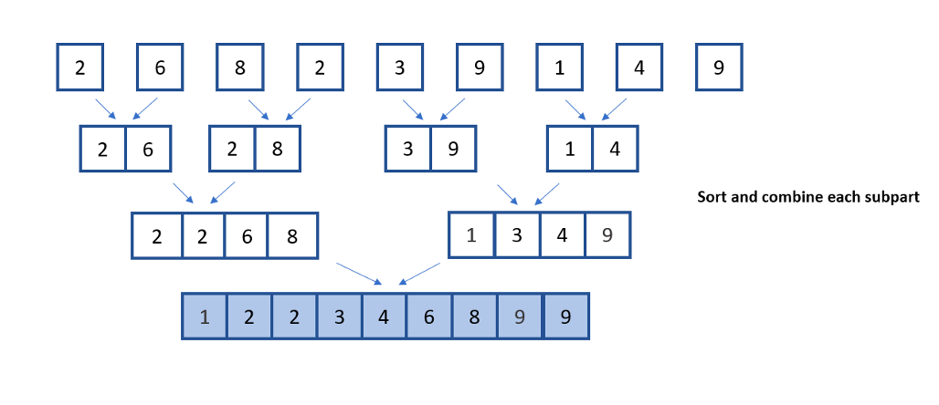 Введем вспомогательную операцию слияния двух отсортированных массивов. Эта операция принимает два отсортированных массива и объединяет их в один отсортированный массив. Это легко можно сделать, если создать два указателя, которые будут указывать на начало каждого массива. Затем мы будем сравнивать элементы, на которые указывают указатели, и добавлять меньший элемент в результирующий массив. После этого мы будем двигать указатель на массив, из которого был взят элемент. Когда один из массивов будет полностью обработан, мы просто добавим оставшиеся элементы другого массива в результирующий массив.