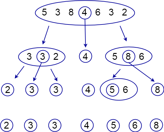 Также можно понимать, что в худшем случае сложность быстрой сортировки составляет \({\cal{O}(n^2)}\), например, когда разбиение массива происходит неудачно и массив разбивается на две части, одна из которых содержит \(1\) элемент, а другая – \(n-1\) элементов. В этом случае быстрая сортировка будет работать так же, как сортировка выбором.